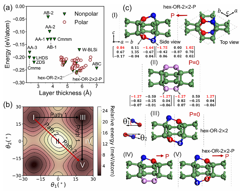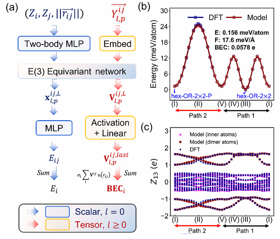 近日,我系向红军教授课题组和湘潭大学何朝宇教授课题组在硅基铁电材料研究中取得重要进展。相关研究成果以“Prediction of Room Temperature Ferroelectricity in Subnano Silicon Thin Films with an Antiferroelectric Ground State”为题,于2025年10月7日发表在《Physical Review Letters》上。 将铁电材料与硅芯片技术相结合,以开发高性能、低功耗的新型存储和电子器件,是当前材料科学领域的关键目标。然而,目前主流的铪基铁电薄膜存在疲劳、矫顽场高等问题,限制了其应用。在纯硅中实现可在室温以上稳定工作的铁电性,是集成电路领域长期追求但极具挑战性的目标。 本研究通过第一性原理结构搜索方法,系统地预测了多种稳定的纯硅薄膜结构。研究团队发现了一种全新的亚纳米厚度铁电硅薄膜(hex?OR?2×2?P),其能量仅比反铁电基态(hex?OR?2×2)高1 meV/atom。两种物相均为带隙约1.3 eV的半导体,并具有优异的动力学和力学稳定性。 为了精确模拟该体系在电场下的动力学行为,研究团队开发了一种先进的机器学习模型DREAM,该模型能够同时高效预测原子间势和玻恩有效电荷。模拟结果显示,尽管该材料的基态是反铁电序,但在室温下却表现出稳健的铁电滞回线,其矫顽电场低至约0.05 V/?,且具有优异的抗疲劳特性。进一步的有效哈密顿量模型分析表明,这种反常的铁电行为源于硅薄膜上下表面之间微弱的反铁电耦合作用。 本研究首次从理论上证实了在具有反铁电基态的纯硅亚纳米薄膜中实现室温可翻转铁电性的可能性,为设计与现有硅工艺兼容的新型存储器、传感器和能量转换器件开辟了新的路线。 我系博士生于宏宇和邓诗涵为论文共同第一作者,向红军教授和湘潭大学何朝宇教授为共同通讯作者。我系的博士后朱海燕、博士生谢牧廷、湘潭大学张宇文、师习之以及上海大学钟建新教授参与了该工作。该工作获得了复旦大学物理系、计算物质科学教育部重点实验室、应用表面物理国家重点实验室、国家自然科学基金、国家重点研发计划、上海市科委等的大力支持与资助。向红军课题组从事计算凝聚态物理,侧重于计算方法(包括机器学习方法)发展和程序开发等方面的研究。 文章信息: Prediction of Room Temperature Ferroelectricity in Subnano Silicon Thin Films with an Antiferroelectric Ground State, Hongyu Yu, Shihan Deng, Haiyan Zhu, Muting Xie, Yuwen Zhang, Xizhi Shi, Jianxin Zhong, Chaoyu He, and Hongjun Xiang, Phys. Rev. Lett. 135, 156801 (2025). https://doi.org/10.1103/xlkt-4wk5 图1. Si薄层结构及能量、born有效电荷信息。 图2. 机器学习模型以及其精度。 图3. 有效模型与模拟结果。